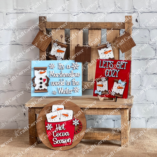 Marshmallow Snowman Smores Decor Set - DIY seasonal home decor craft kit - 1 set of 4 pieces