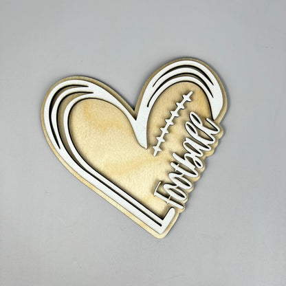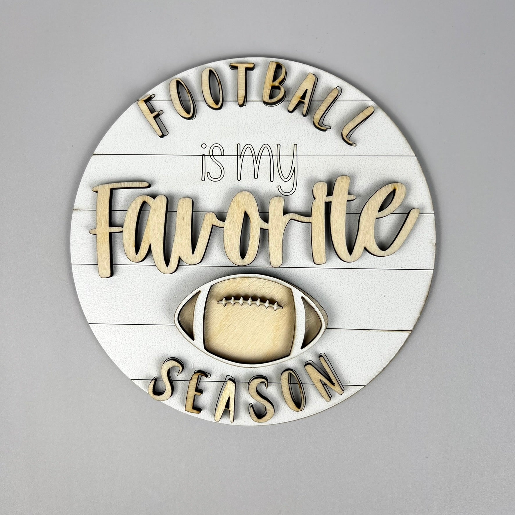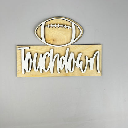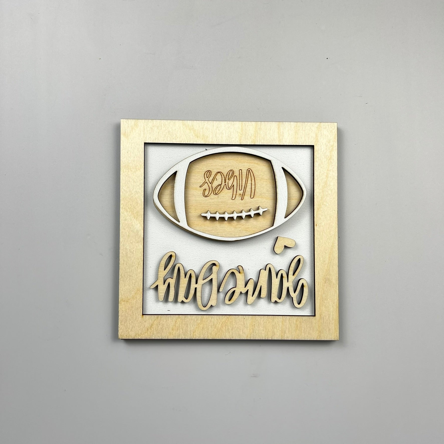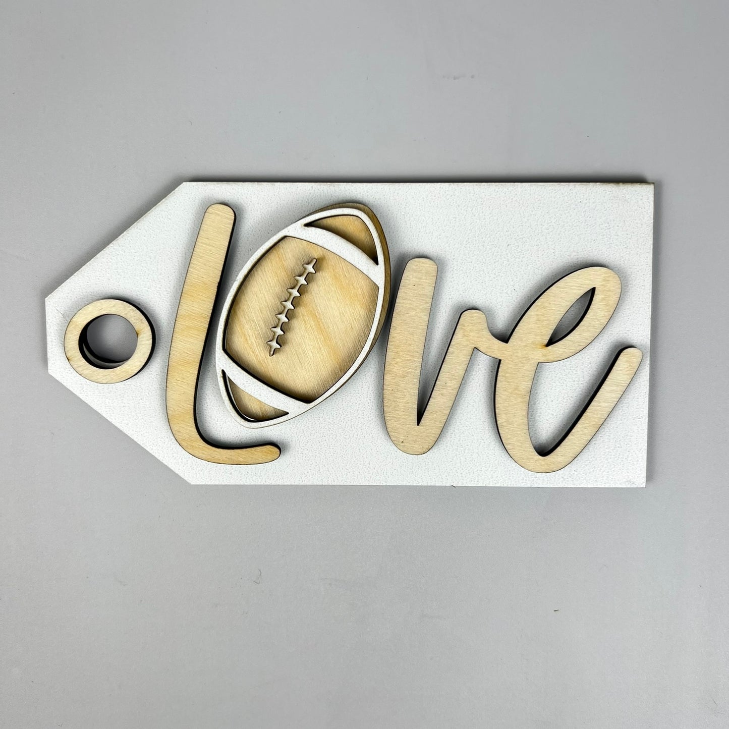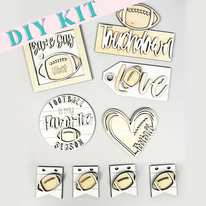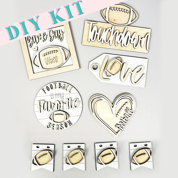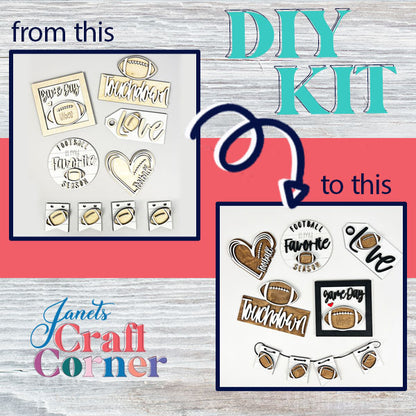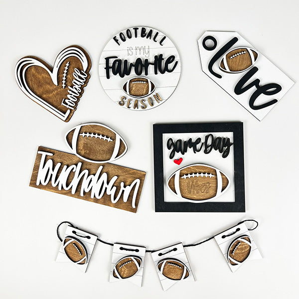 The finished products measures approximately: Touchdown 4.7" tall x 6.8" wide, Love Tag 3" tall x 6" wide, Heart 4.7" tall x 4.7" wide, Game Day " square and Football Season 5" round . Includes wood cut-outs to make 1 shelf sitter unless a set is purchased. Set includes wood cut-outs to make 5 shelf sitters. If you want to paint the set in the stained, white and black that we used, we recommend upgrading to the birch wood. With this kit, the birch kit will include both birch and white pieces as shown in the fourth photo.
